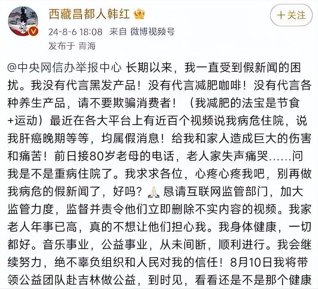 2020年2月20日晚,官方调查结果正式公布:韩红基金会整体运作规范,抗疫工作贡献突出,贪污挪用善款等指控被彻底否定。通报揭开真相——所谓3亿不明投资实为合法低风险理财,收益全部用于救灾;争议名表是品牌活动借用物品已归还;非法募捐是2018年前未获公募资格时的历史问题,早已整改。数据显示,基金会成立至2020年累计收到捐赠5.31亿元,疫情期间3.29亿元善款精准送达湖北271家医疗机构,韩红个人更是捐出4000万元及母亲遗产。举报人杨宏伟的真面目随后被揭穿。他并非正义使者,而是靠捏造明星丑闻赚取流量的惯犯。2023年,杨宏伟因发布虚假信息被平台永久封禁,关于韩红的举报内容全部删除,这场闹剧终以他身败名裂收场。面对这场无妄之灾,韩红没有起诉追责,只是默默回到公益一线,哽咽着说对得起良心就够了。